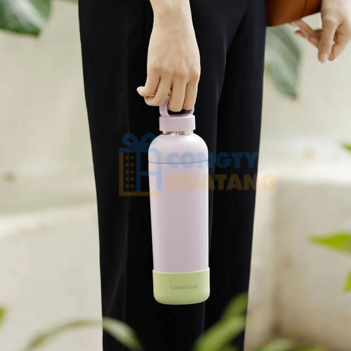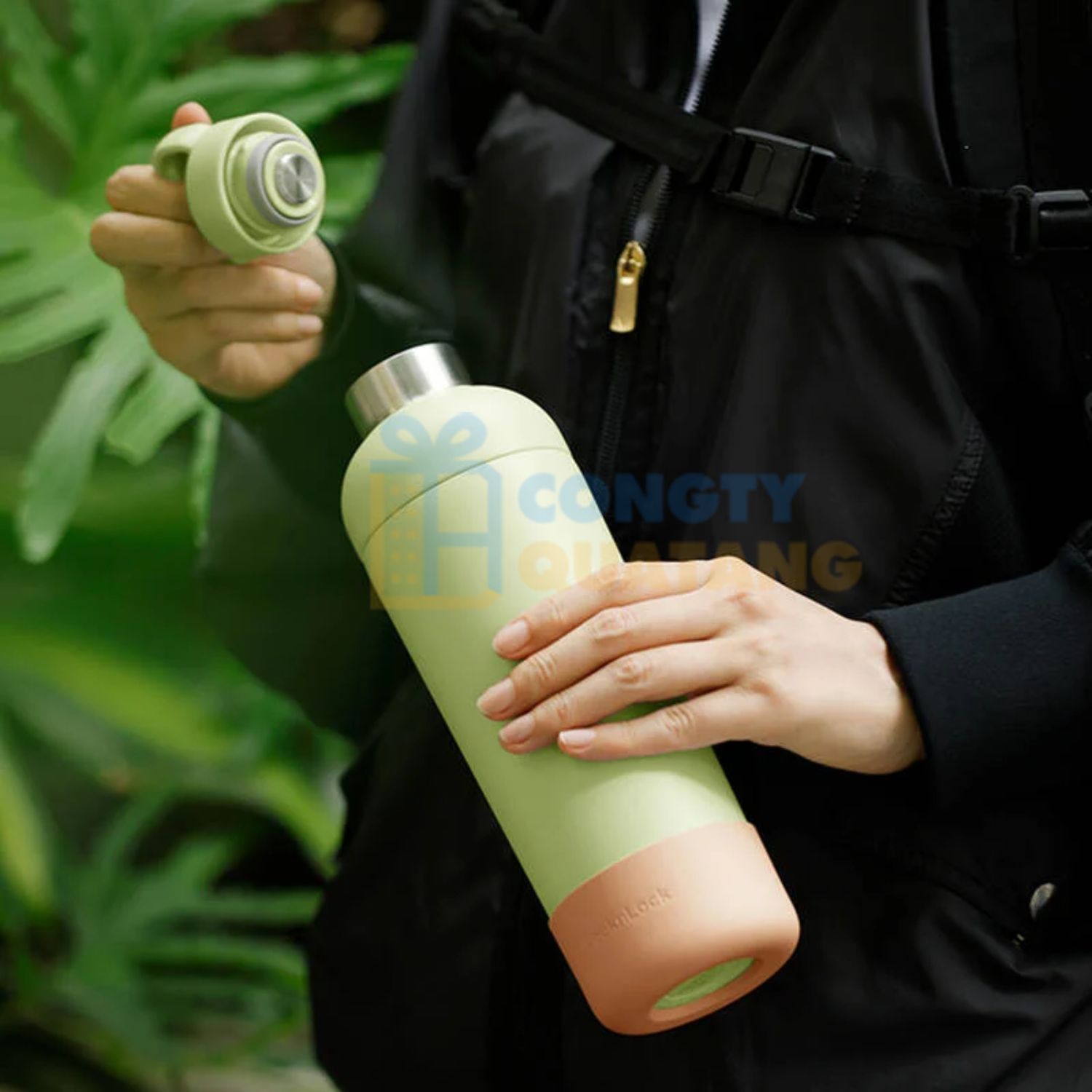 Bình được thiết kế với tay cầm chắc chắn, thân bình thon gọn dễ dàng cầm nắm, cùng với phần đế được bọc silicone chống trượt. Chi tiết này giúp hạn chế trầy xước và giảm tiếng ồn khi đặt bình xuống các bề mặt, mang lại sự tiện lợi và ổn định tối đa cho người dùng năng động.