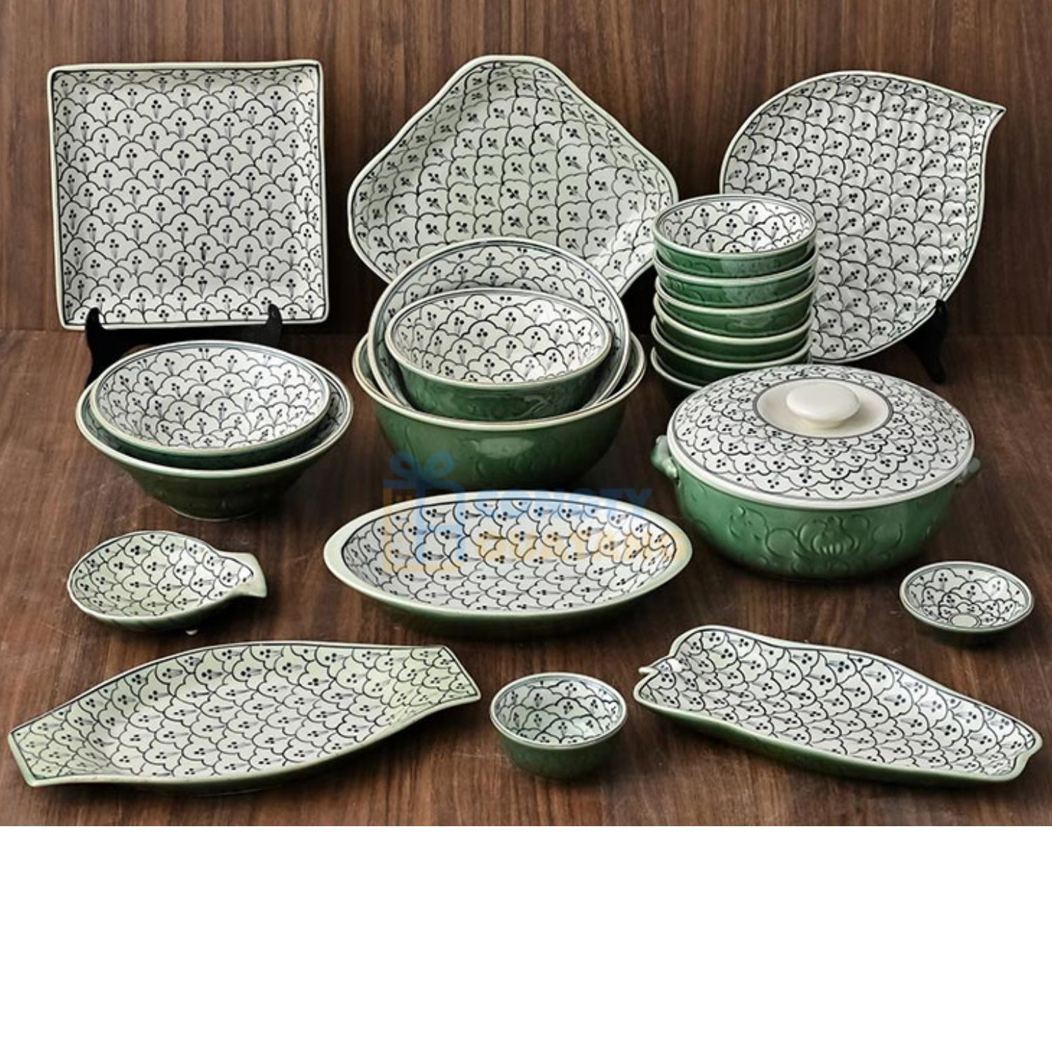 - Bộ sản phẩm bao gồm nhiều món như bát, đĩa, tô, khay… với thiết kế đồng bộ, đáp ứng đầy đủ nhu cầu sử dụng trong bữa ăn gia đình hay những dịp đặc biệt. Nhờ chất liệu sứ bền đẹp kết hợp hoa văn thủ công tinh tế, bộ bát đĩa không chỉ mang tính tiện dụng mà còn tôn thêm vẻ sang trọng cho không gian bàn ăn. Đây cũng là lựa chọn quà tặng cao cấp, thể hiện sự tinh tế và trân trọng.