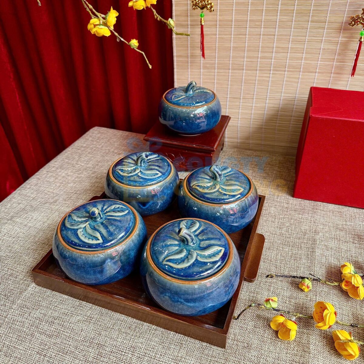 Bộ hũ mứt Tết men hỏa biến xanh lam dáng quả bí kèm khay gỗ KMT-24 là mẫu hũ trang trí cao cấp, nổi bật với dáng quả bí tròn đầy tượng trưng cho tài lộc và sung túc. Thiết kế độc đáo kết hợp chất liệu gốm sứ thủ công giúp sản phẩm trở thành điểm nhấn sang trọng trên bàn trà, khay mứt hay không gian Tết Việt.