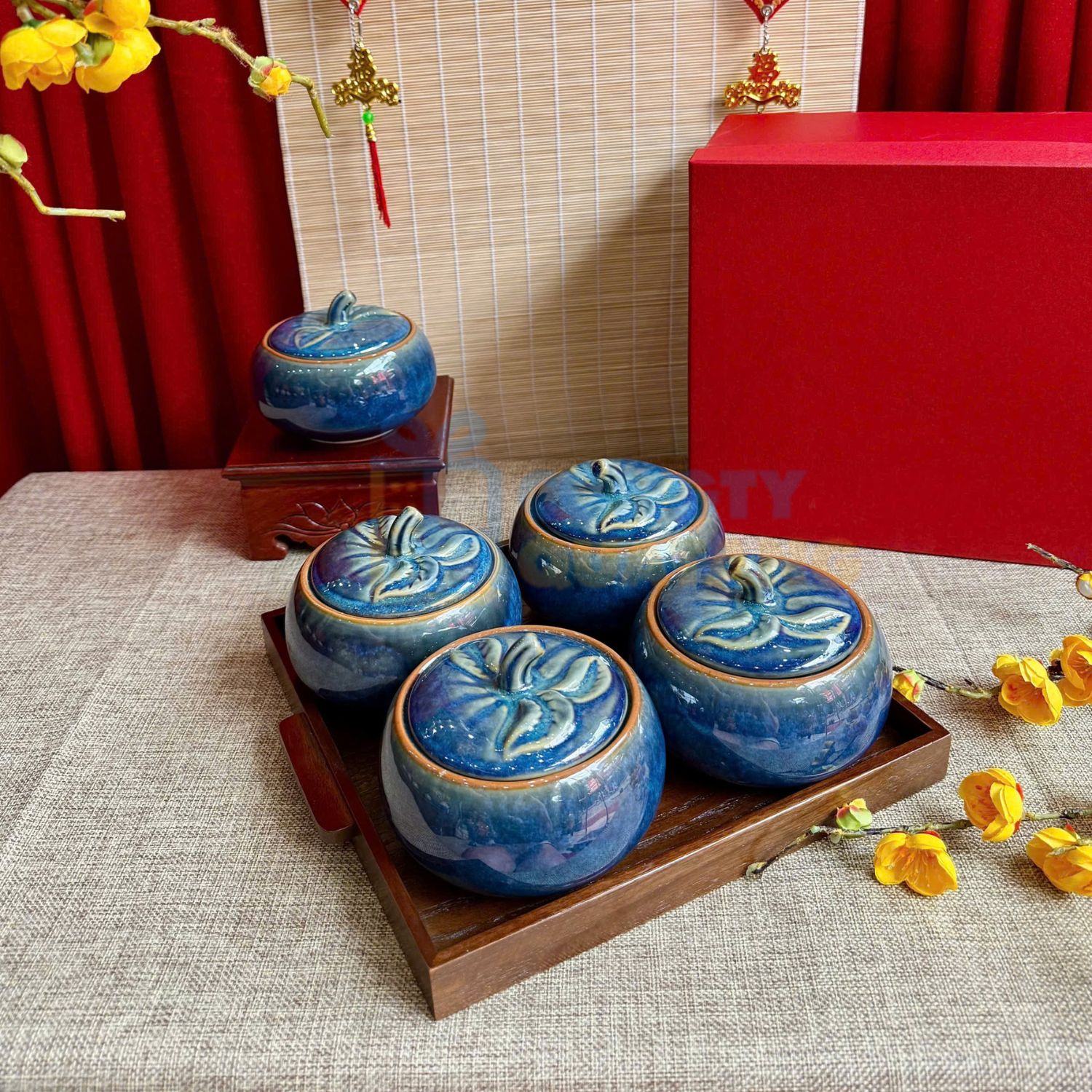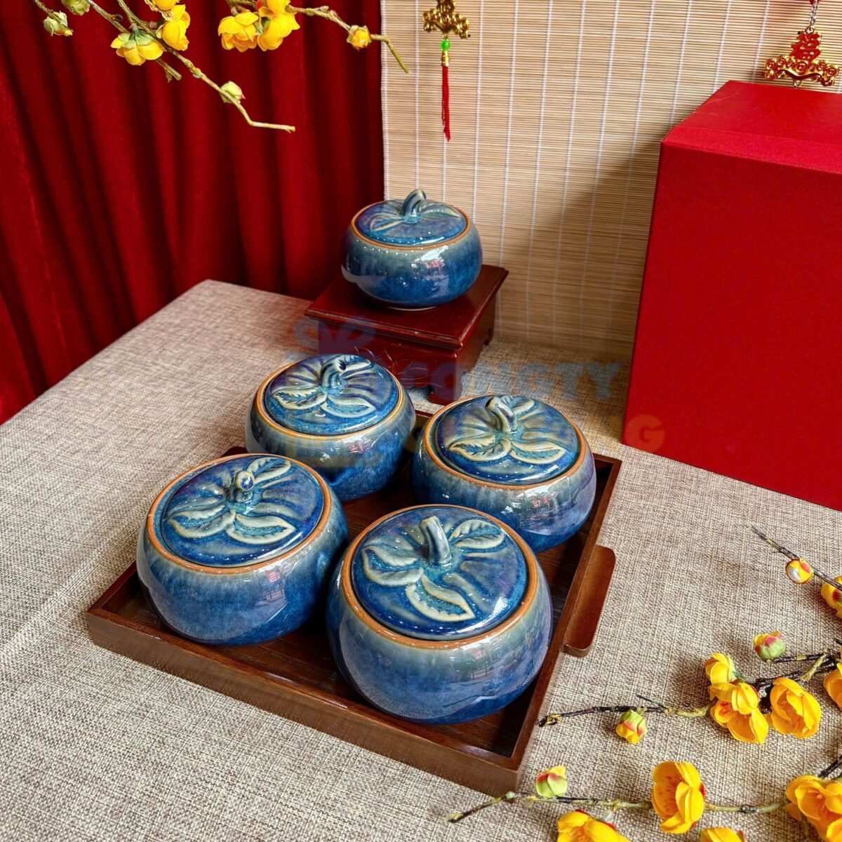 Bộ hũ mứt Tết men hỏa biến xanh lam dáng quả bí kèm khay gỗ KMT-24 là mẫu hũ trang trí cao cấp, nổi bật với dáng quả bí tròn đầy tượng trưng cho tài lộc và sung túc. Thiết kế độc đáo kết hợp chất liệu gốm sứ thủ công giúp sản phẩm trở thành điểm nhấn sang trọng trên bàn trà, khay mứt hay không gian Tết Việt.