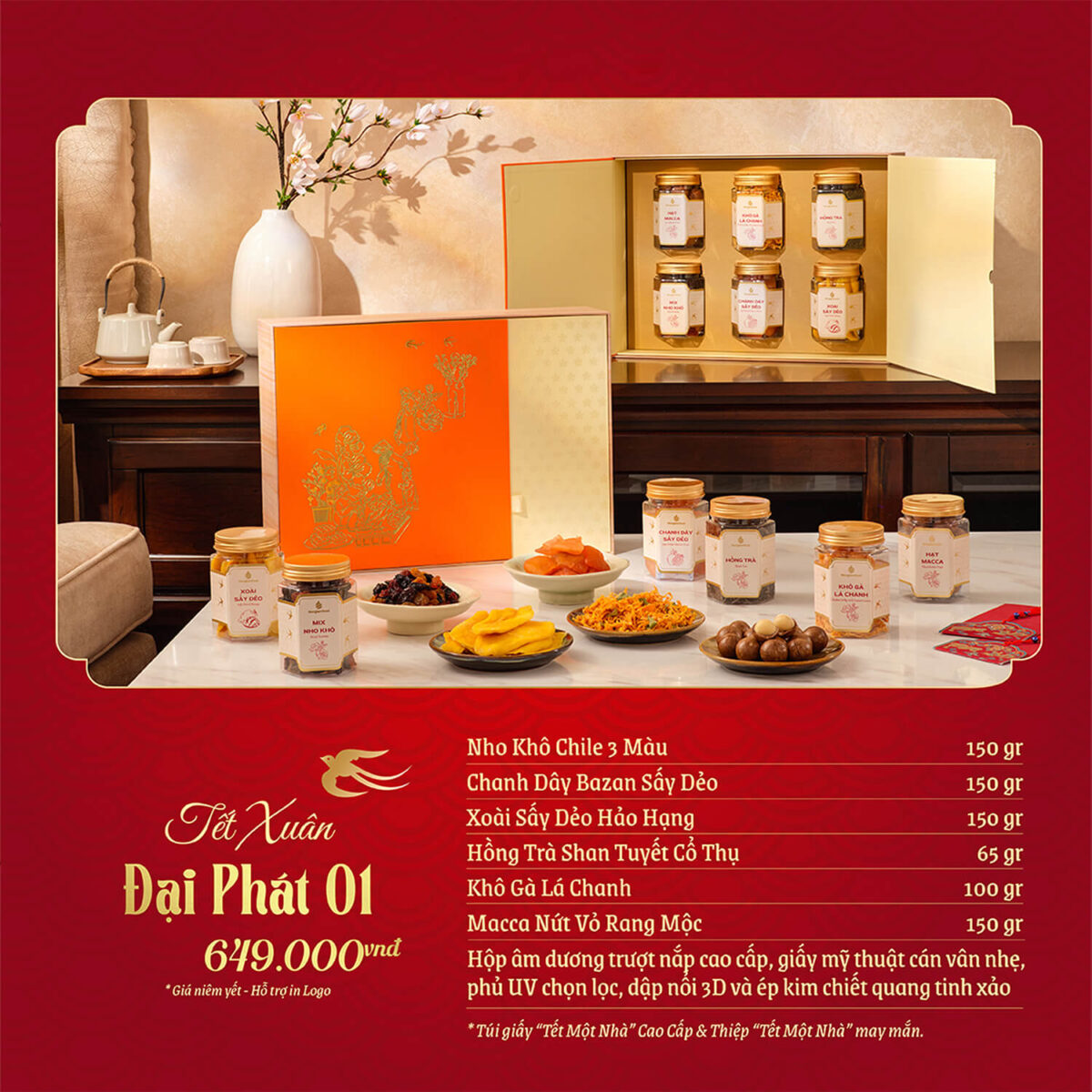 Bộ quà tặng Tết Đại Phát GS06 là lựa chọn sang trọng dành tặng khách hàng, đối tác và người thân trong dịp Tết Nguyên Đán. Với thiết kế hộp quà tinh tế, gam đỏ – vàng mang ý nghĩa cát tường, set quà gửi gắm lời chúc đại phát – an khang – thịnh vượng cho năm mới.