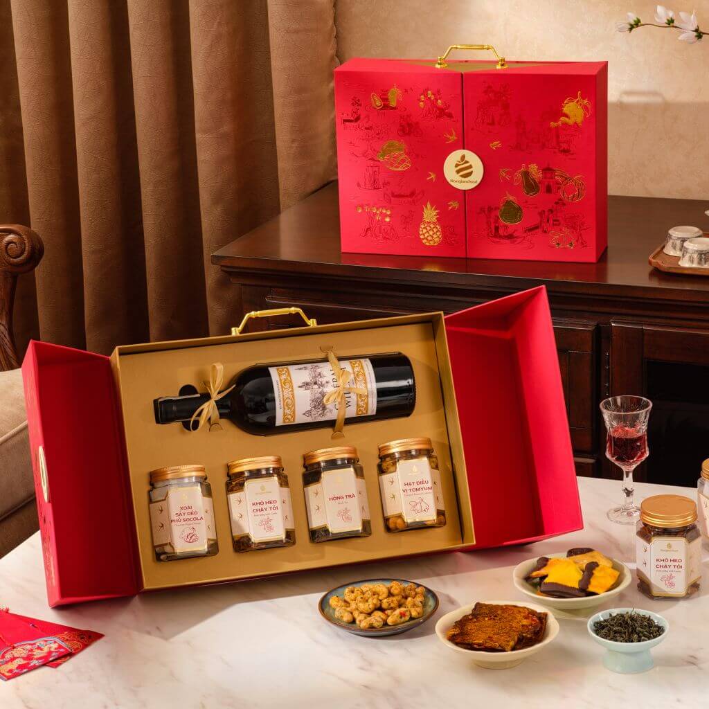 Bộ quà kết hợp hương vị đặc sản và thiết kế hộp vali cánh bướm, giấy mỹ thuật cán vân, ép kim phủ toàn bề mặt, UV và dập nổi 3D, tạo nên vẻ ngoài sang trọng. Đây là lựa chọn hoàn hảo để gửi trao lời chúc năm mới sung túc, an khang và hạnh phúc đến người thân, bạn bè và đối tác.