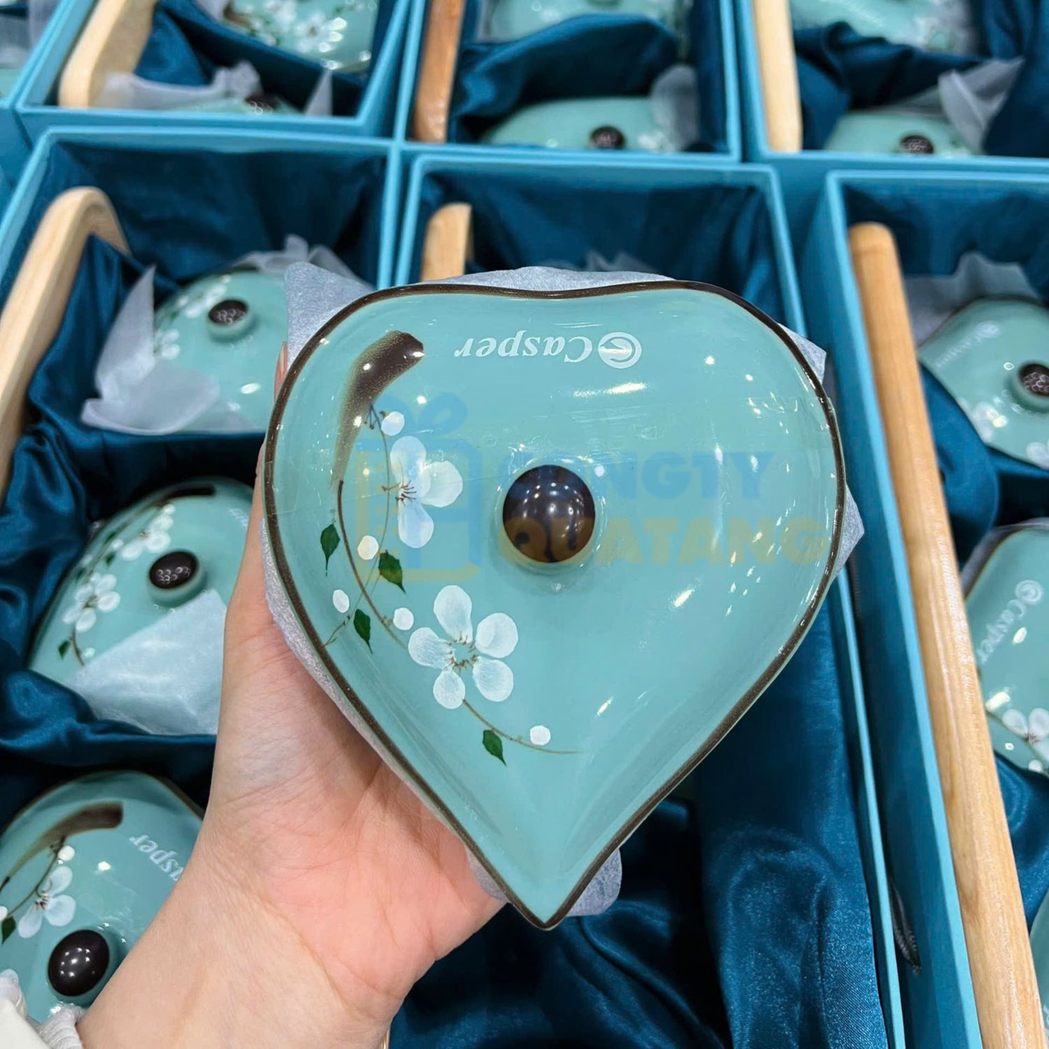 Khay mứt Tết gốm sứ Bát Tràng hình trái tim men xanh ngọc vẽ hoa đào trắng KMT-08