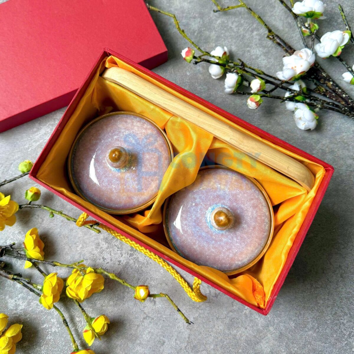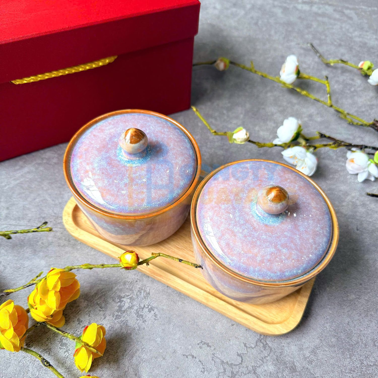 Hũ đựng mứt sở hữu lớp men hoả biến san hô tím – tinh hoa của nghệ thuật nung gốm Bát Tràng. Hiệu ứng chuyển màu tự nhiên tạo nên vẻ đẹp độc bản, không có hai sản phẩm giống nhau. Chất men bóng, sâu màu, sang trọng, giúp không gian bày trí thêm nổi bật trong ngày Tết.