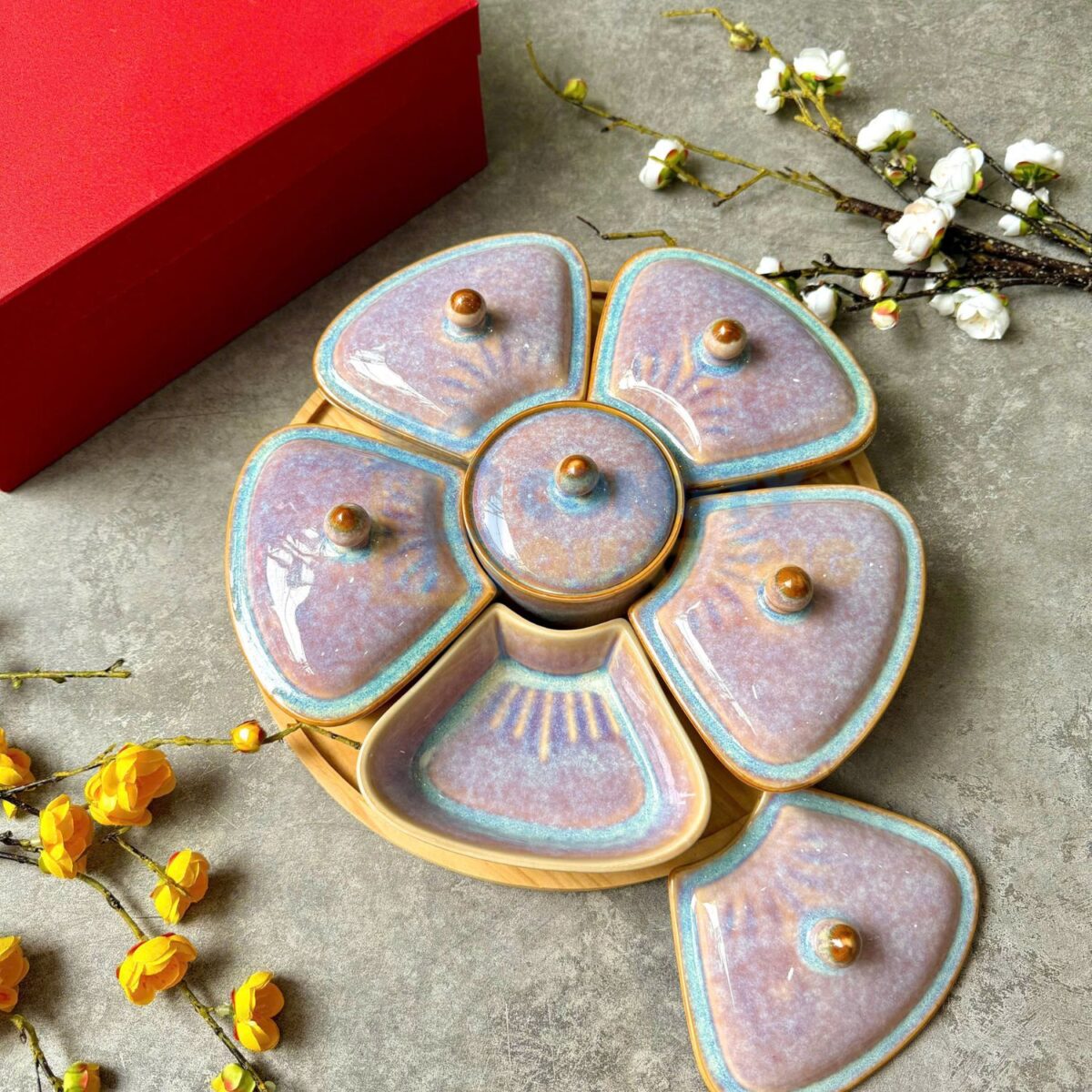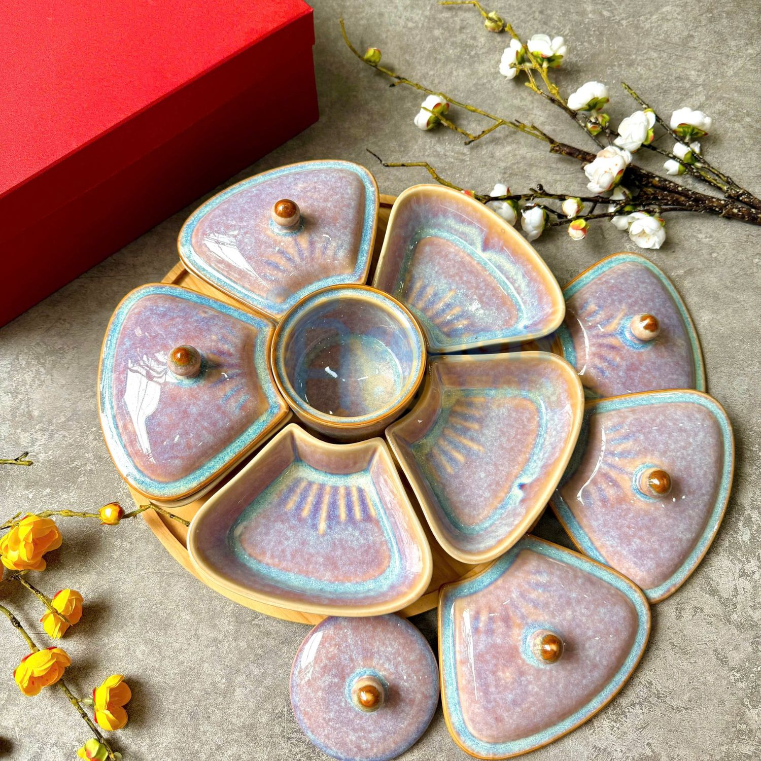 Khay mứt Tết gốm sứ Bát Tràng men hoả biến san hô tím KMT-06
