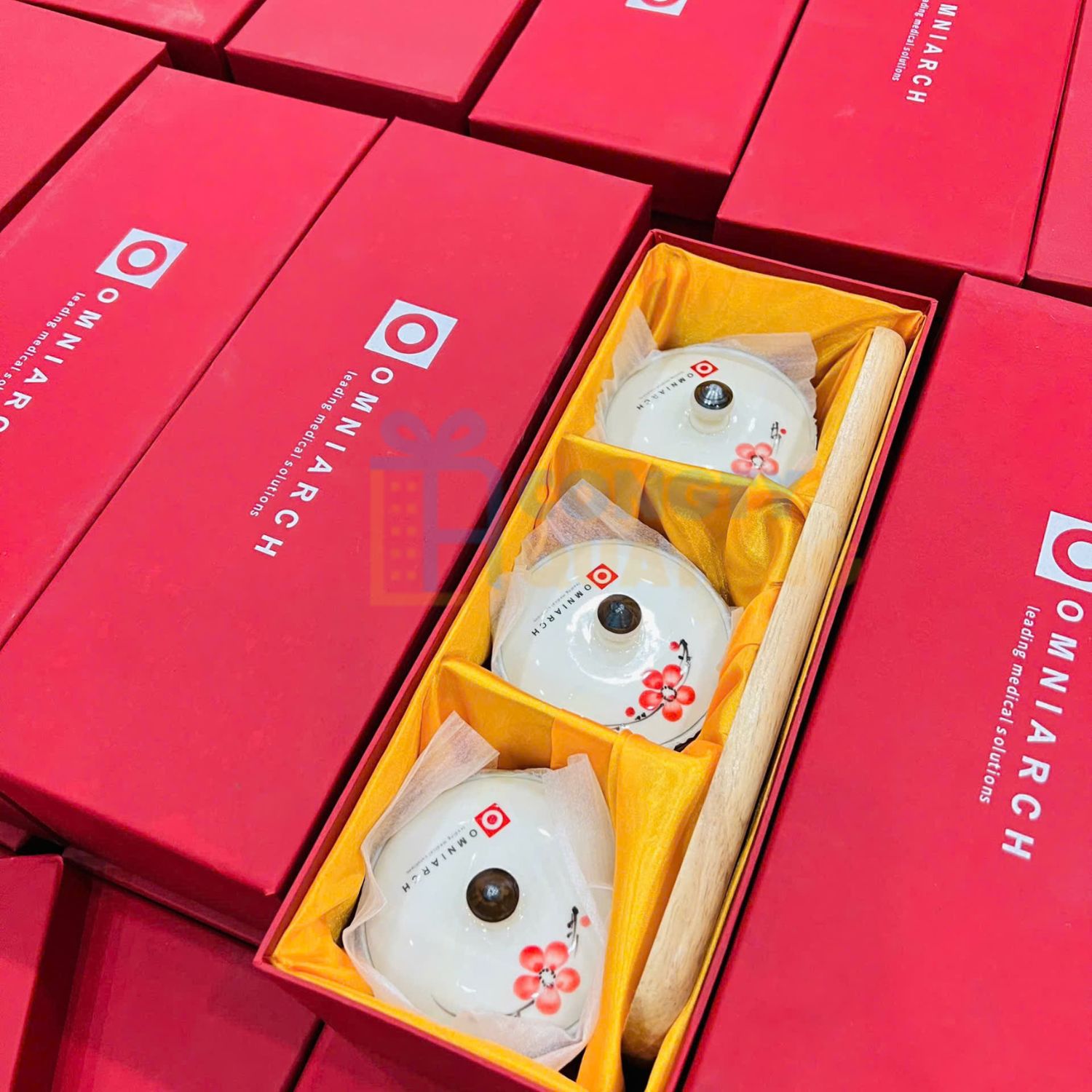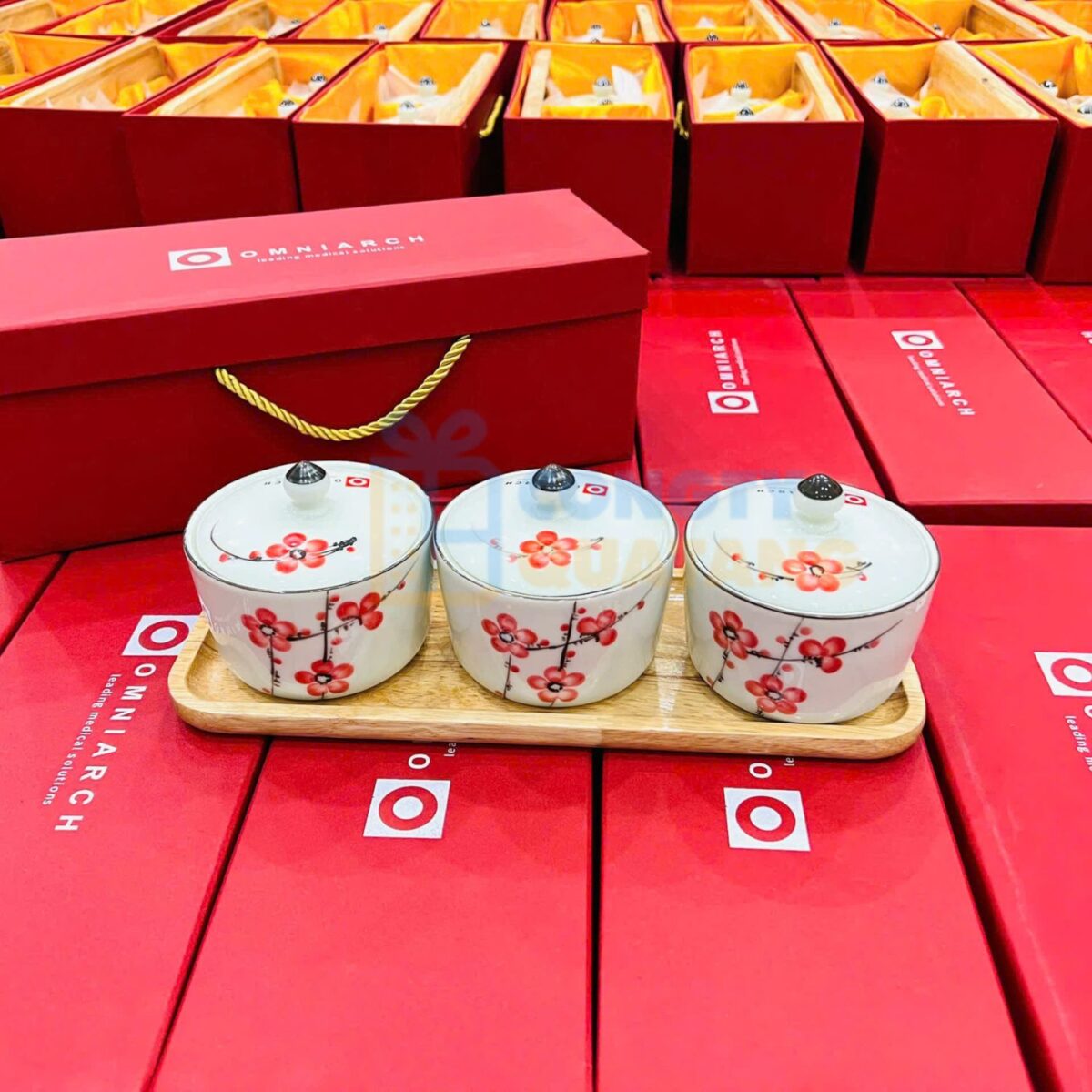 Họa tiết hoa đào đỏ vẽ tay tinh xảo kết hợp với men sứ sáng bóng, tạo vẻ đẹp sang trọng và hiện đại. Bộ sản phẩm có dạng 3 hũ, 5 hũ và 7 hũ giúp trưng bày đa dạng các loại mứt, bánh kẹo, góp phần tạo không khí Tết ấm cúng và độc đáo.