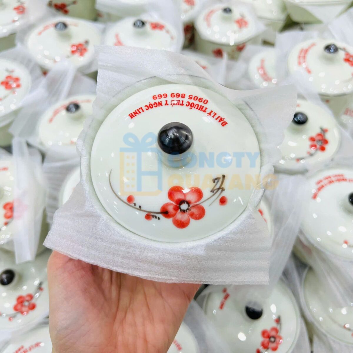 Hộp đựng mứt Tết được thiết kế hình tròn với nắp đậy chắc chắn, tiện lợi cho việc bảo quản bánh kẹo. Sản phẩm an toàn cho sức khỏe, được nung ở nhiệt độ 1300°C, đảm bảo loại bỏ tạp chất có hại.