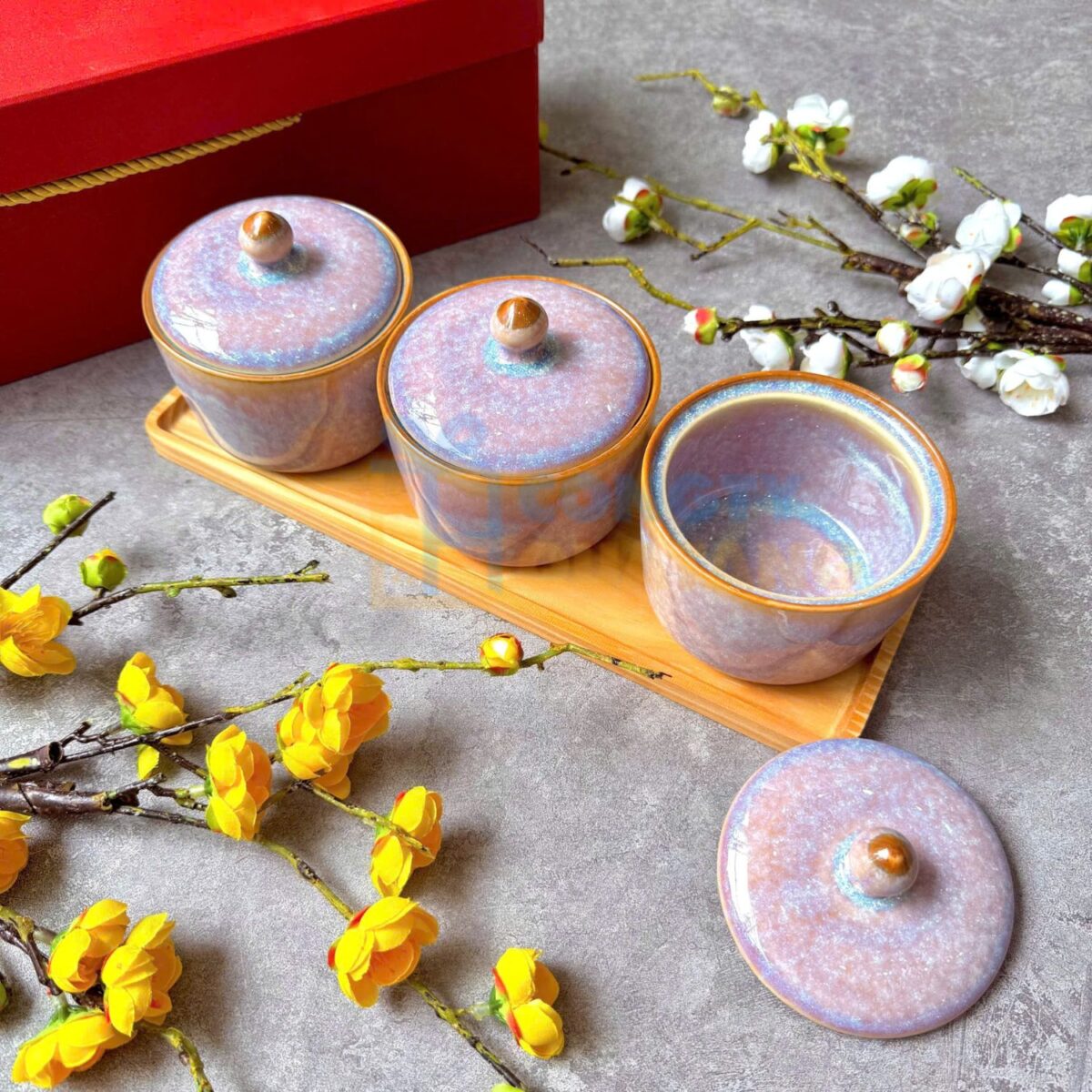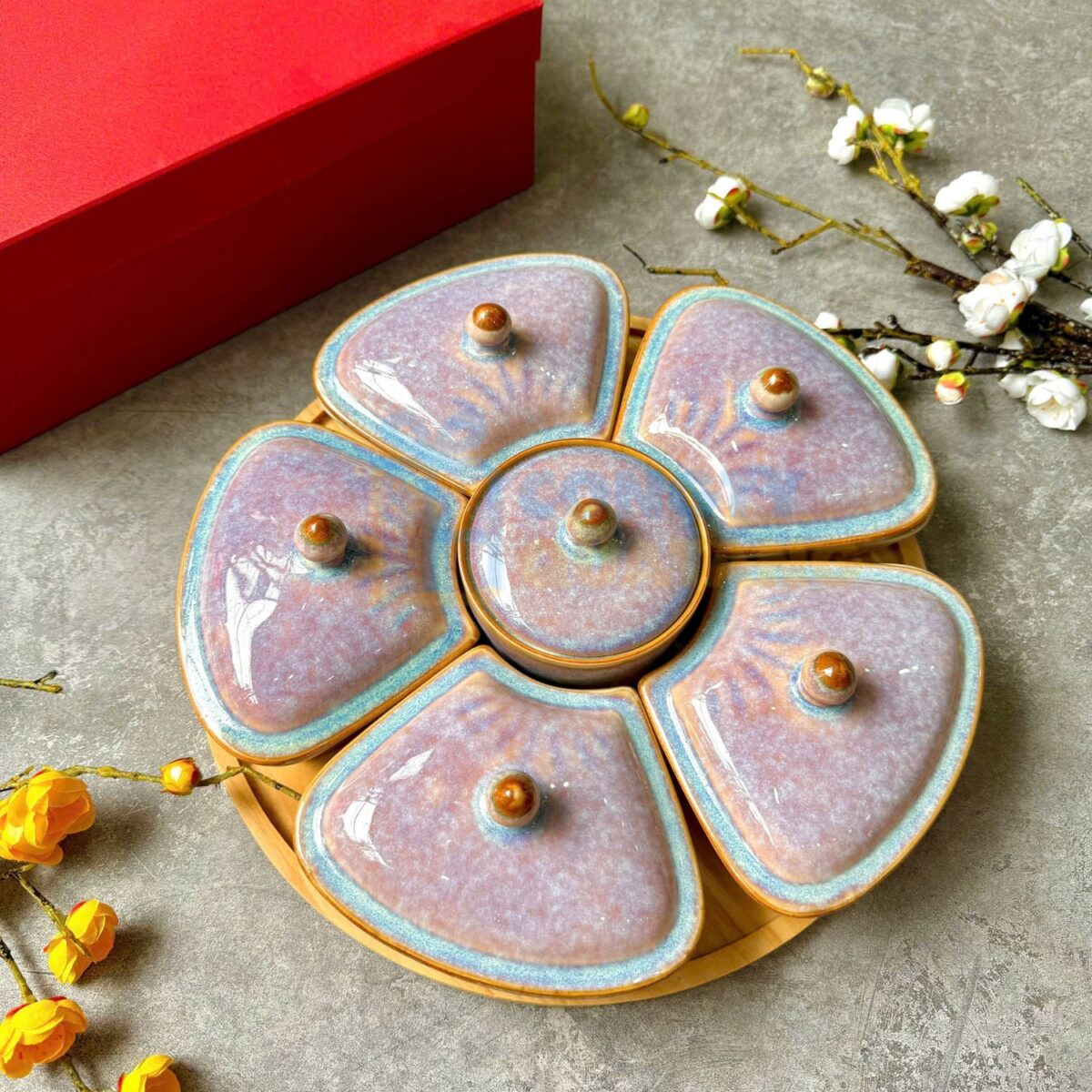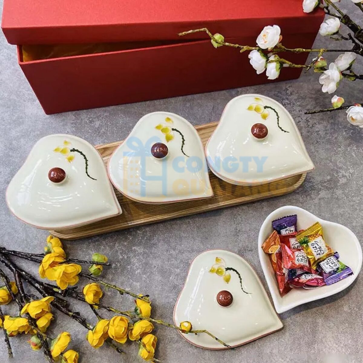 Bộ khay mứt Tết gốm sứ Bát Tràng hình tim sen đỏ KMT-09