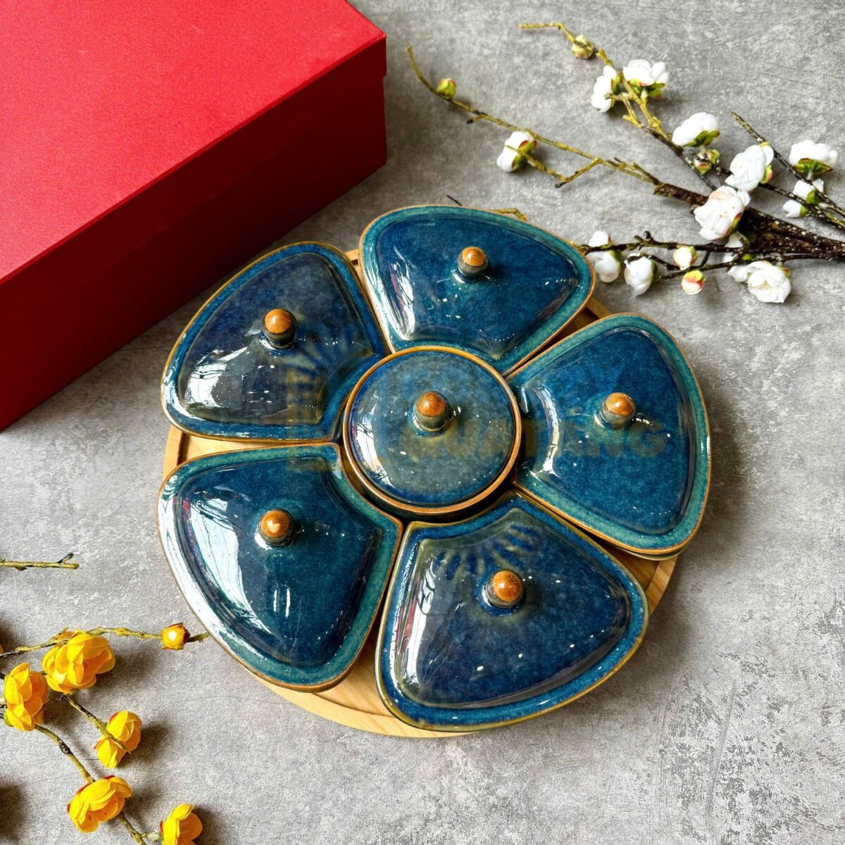 Khay mứt Tết gốm sứ Bát Tràng men hoả biến xanh đại dương KMT-01