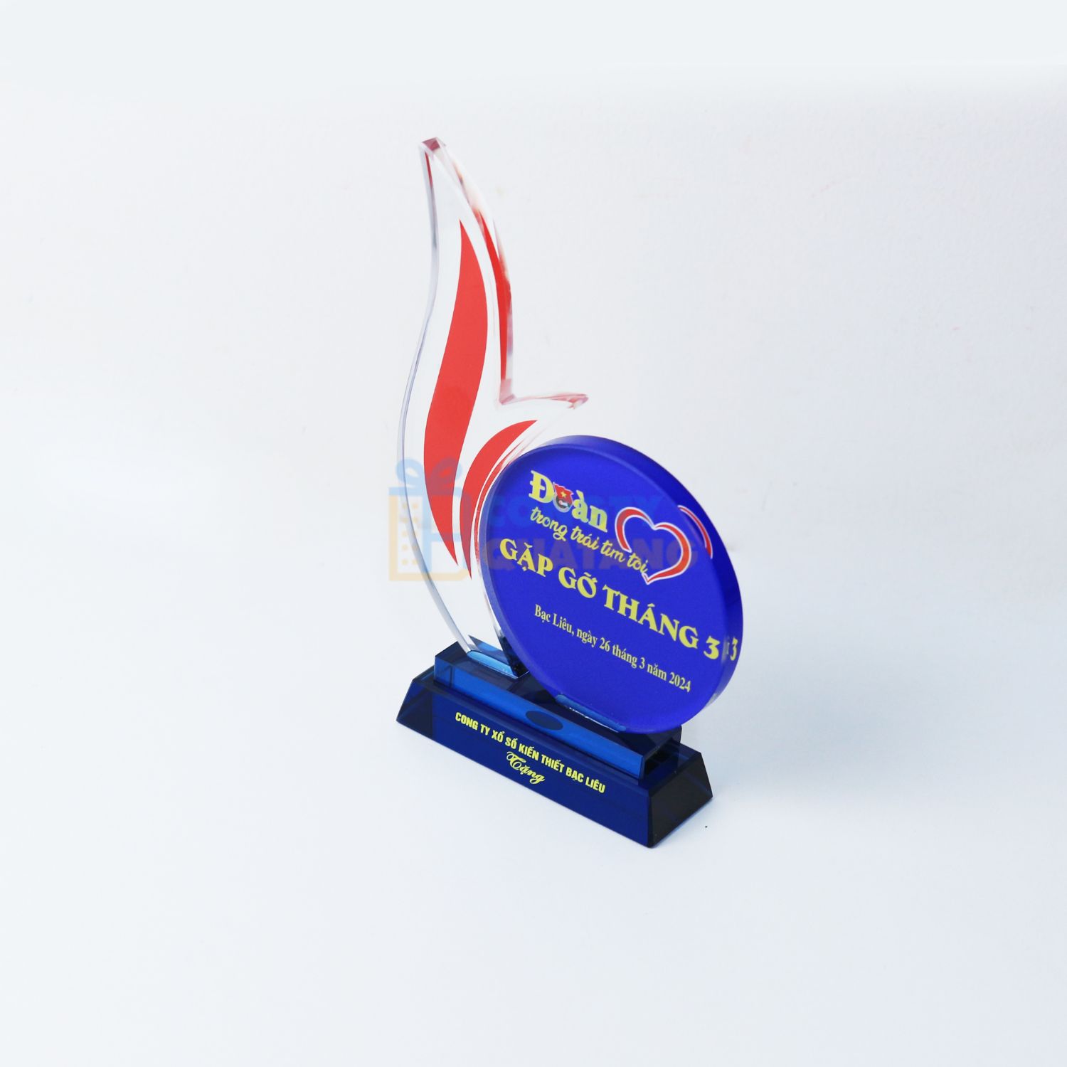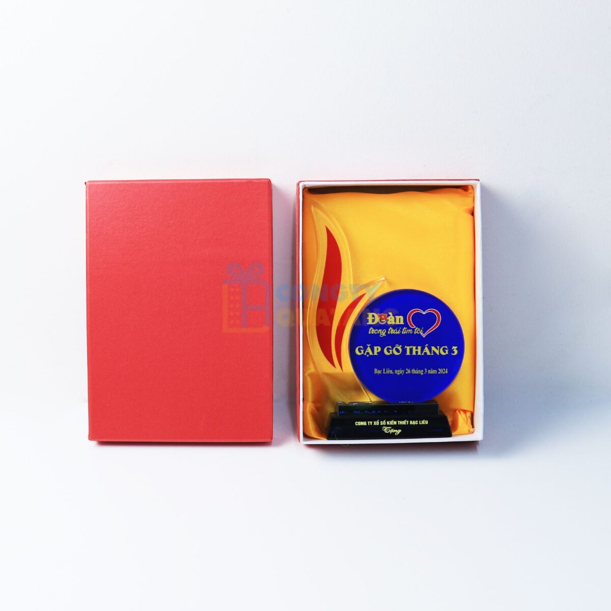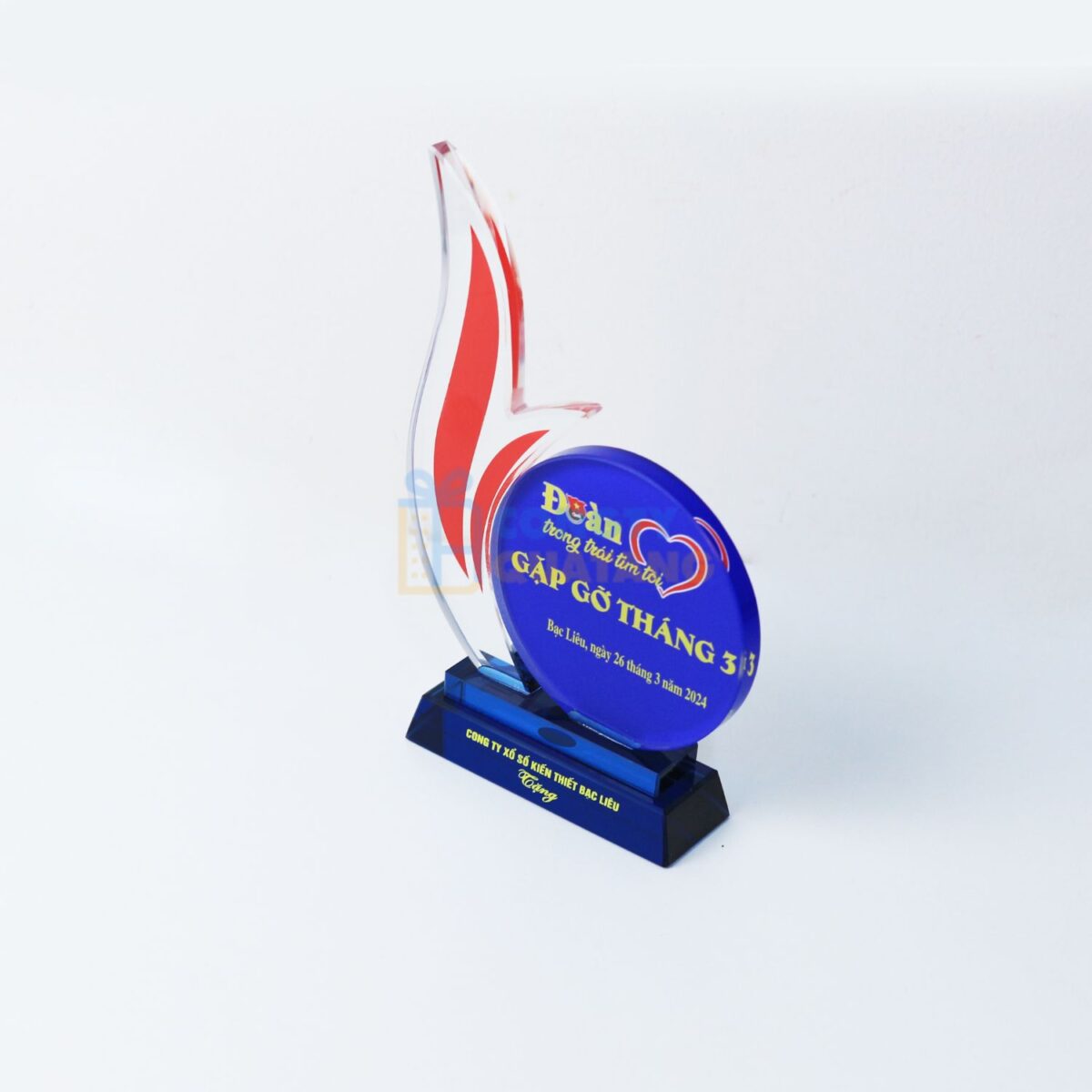 Kỷ niệm chương pha lê PL-117 được thiết kế độc đáo với sự kết hợp giữa hình tròn xanh dương sang trọng và chi tiết ngọn lửa đỏ trắng đầy nổi bật. Sản phẩm mang ý nghĩa vinh danh, tri ân và khích lệ tinh thần, phù hợp trong các sự kiện giao lưu, kỷ niệm hay tôn vinh cá nhân, tập thể. Đây là lựa chọn ấn tượng, vừa mang giá trị thẩm mỹ cao vừa lưu giữ kỷ niệm đặc biệt cho doanh nghiệp và tổ chức.