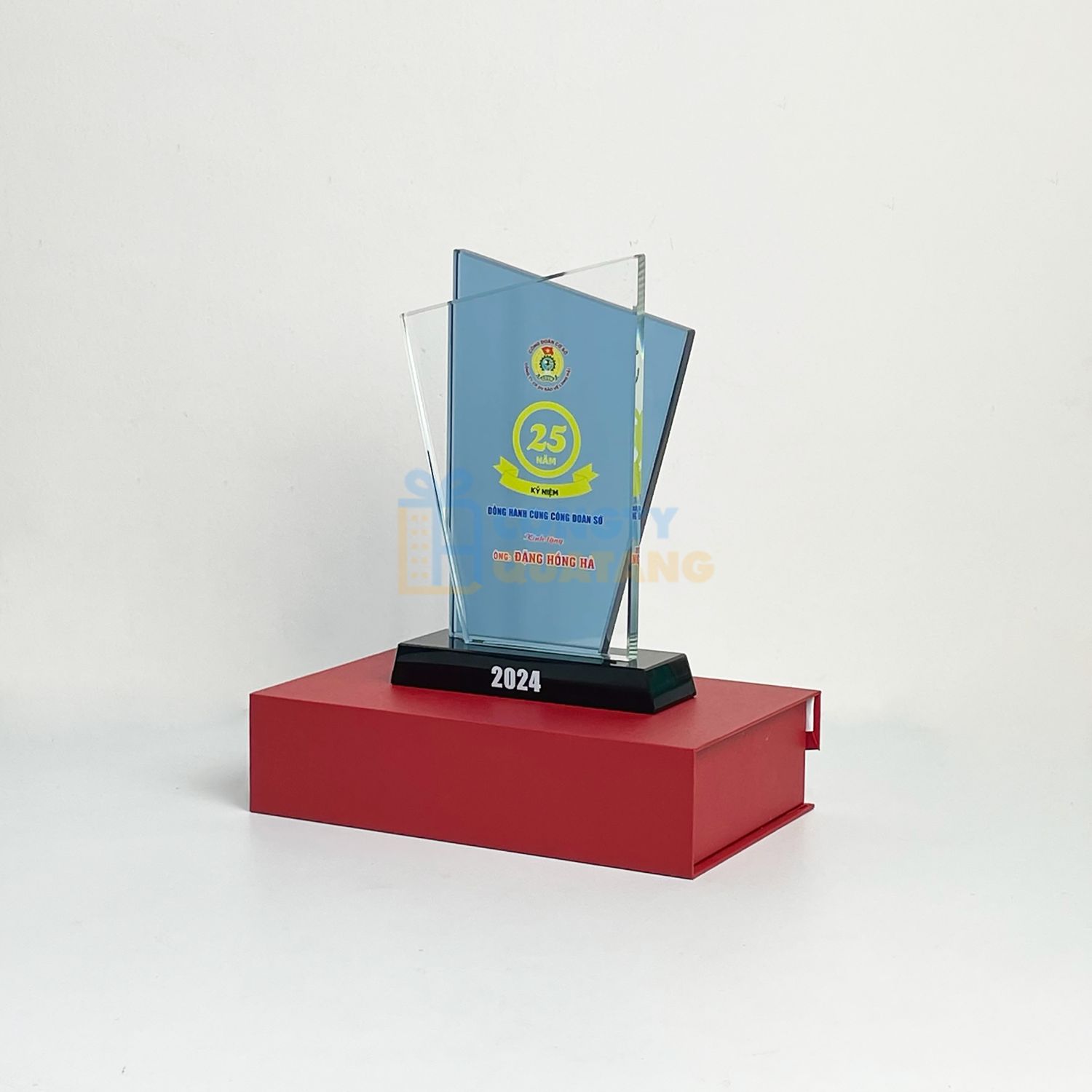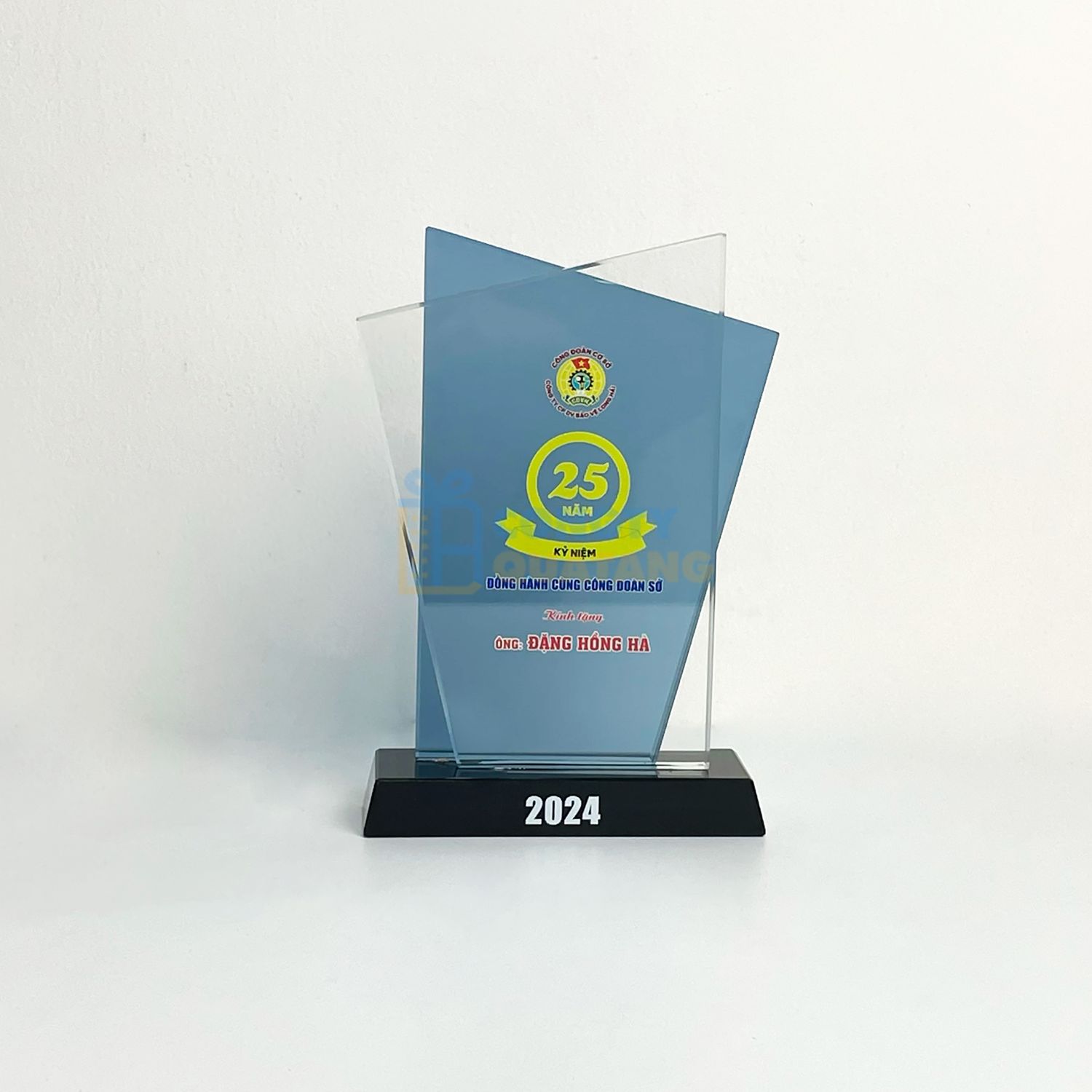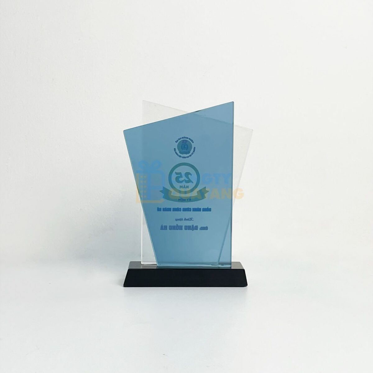 - Màu sắc trang nhã: Gam màu xanh kết hợp cùng nền pha lê trắng, làm nổi bật logo, biểu tượng và thông tin in khắc sắc nét.