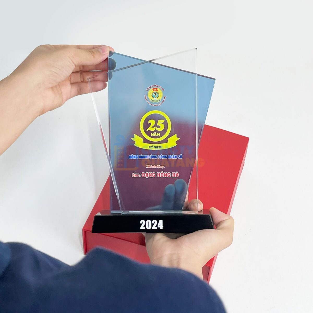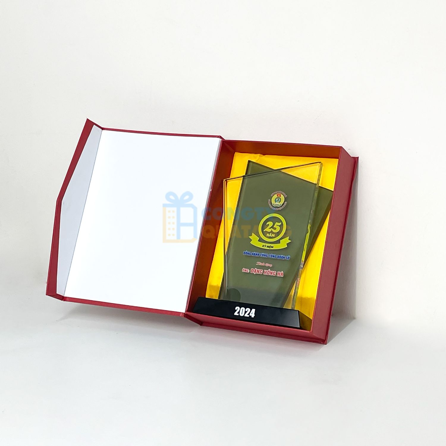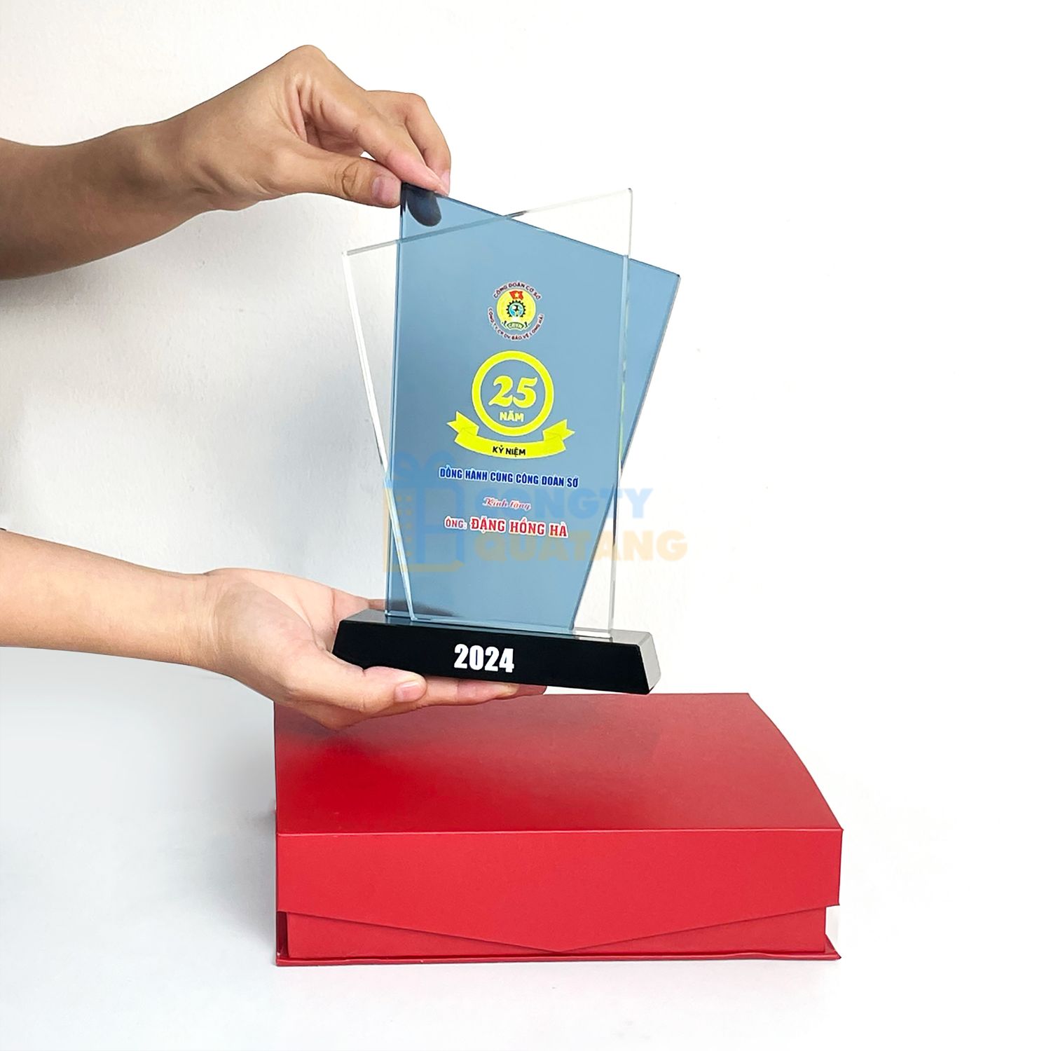 - Màu sắc trang nhã: Gam màu xanh kết hợp cùng nền pha lê trắng, làm nổi bật logo, biểu tượng và thông tin in khắc sắc nét.
