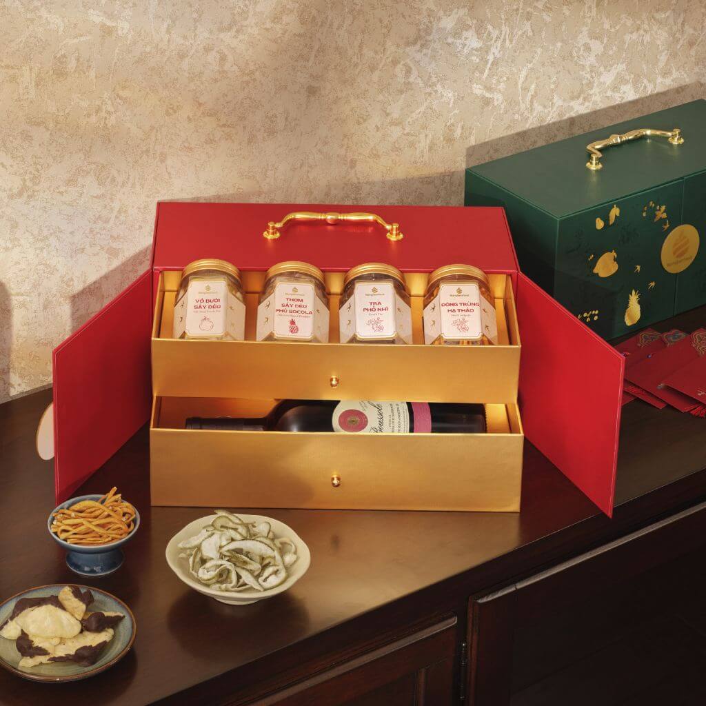 Set quà là sự kết hợp tinh tế giữa rượu vang, trà, đông trùng cao cấp và trái cây sấy, mang đến trải nghiệm ý nghĩa, trang trọng, đẳng cấp. Hộp quà vali 2 tầng được thiết kế tỉ mỉ với ép chìm – phủ UV – điểm nhấn logo vàng 24K, tạo nên một tổng thể sang trọng và ấn tượng, giúp nâng tầm giá trị món quà trong mắt người nhận.