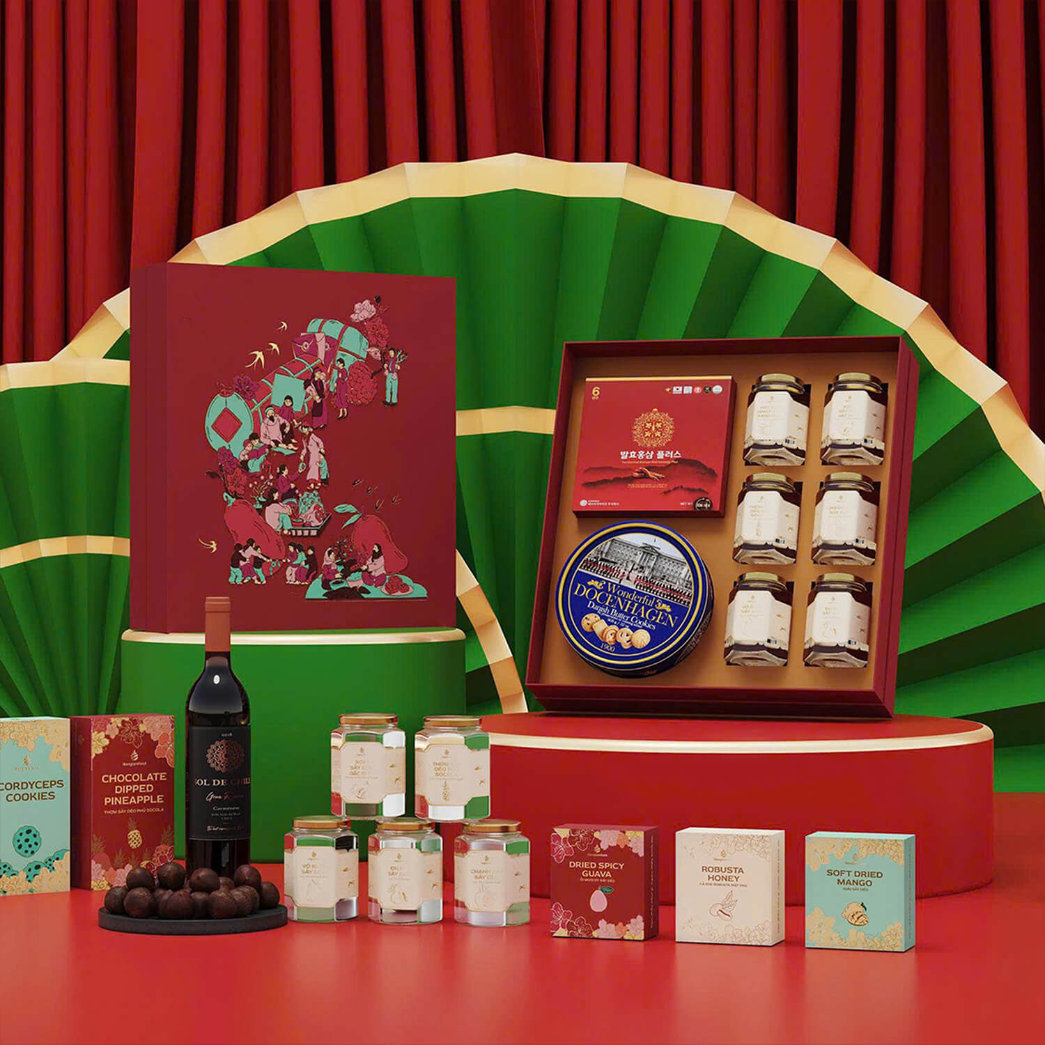 Bộ quà Phát Lộc hòa quyện tinh hoa hương vị Tết: từ sự thượng hạng của Hồng Sâm và Đông Trùng Hạ Thảo, đến vị ngọt bùi của Bánh Quy Danisa, vị mặn cay của Khô Bò và Hạt Điều Tomyum, cùng hương trái cây tươi mát từ Chanh Dây, Vỏ Bưởi và Xoài Cay. Tất cả được trình bày trong hộp âm dương 2 tầng sang trọng, sắc đỏ may mắn kết hợp dập nổi 3D và ép kim chiết quang tinh xảo, tạo nên món quà vừa đẹp mắt vừa ý nghĩa.