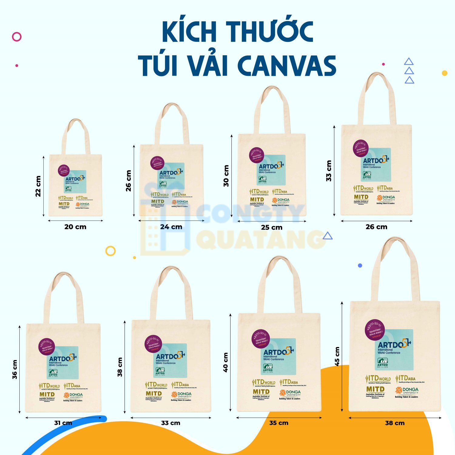 Kích thước chuẩn là 33x38cm, chưa gồm dây kéo, túi con bên trong hoặc phụ kiện khác. DTH Gift có nhận sản xuất túi vải in logo với kích thước theo yêu cầu.